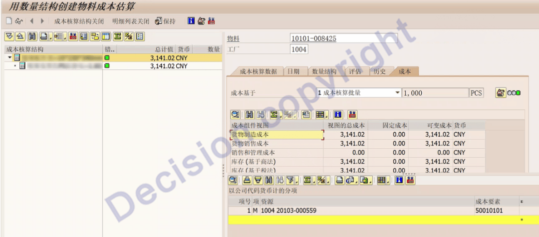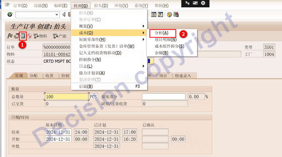 然后退回 工单主画面,计算工单计划成本,查看工单计划成本。