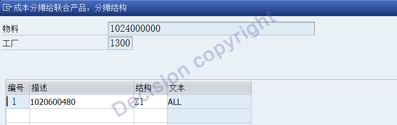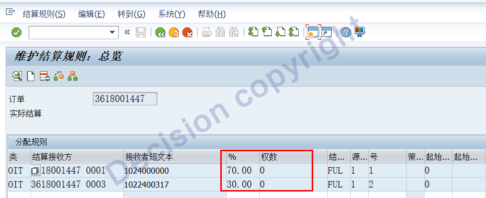 10. At the end of the period, maintain the settlement rules for joint products: ratio or weight = output * coefficient, assuming that the two products bear 70% and 30% respectively. Transaction code CO02 is used for maintenance.