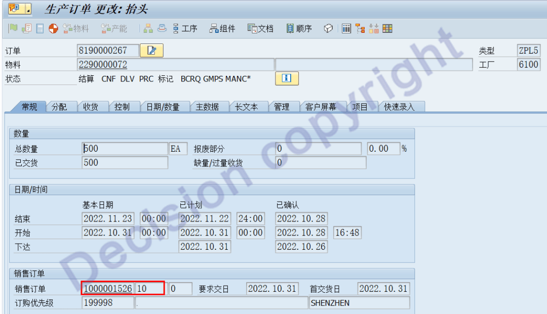 1. For the work orders produced according to the sales order, the relationship between the sales order and the production order is recorded in the order header data, as shown in the following figure: