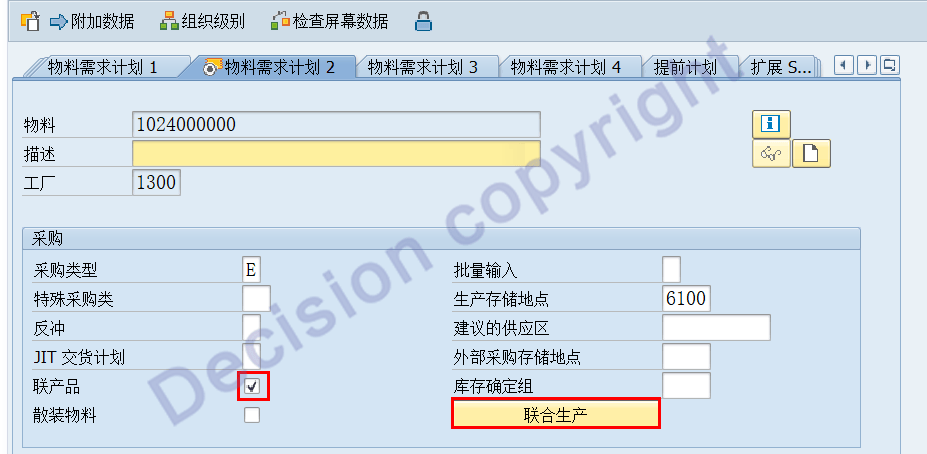 3. Modify the material master data and specify materials: 1024000000, 1022400317 as joint products, which do not require maintenance of equivalents.