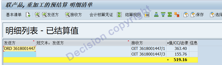 From the above figure, we can see that the total cost of the production order of RMB 519.16 is allocated to two joint products at a ratio of 70% and 30%.