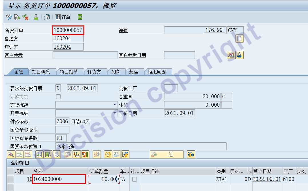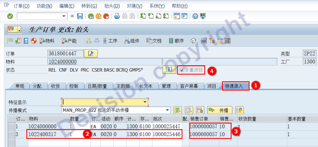 6. Develop tool program, modify the joint product sales order, and change the data table AFPO/COBRB from: 1000000057 to 1000000059.