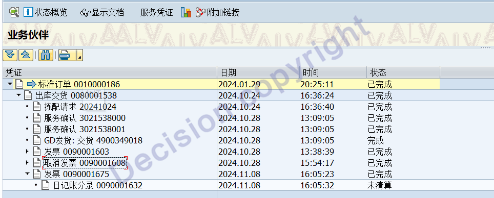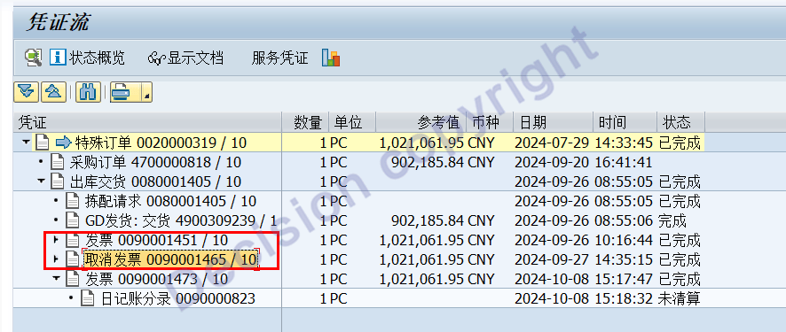 原凭证90001603、冲销凭证90001608 在凭证流中的显示: