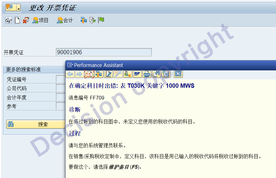 事务码VF02销售开票批准至会计,系统提示FF709找不到T030K表的MWS配置科目,这是什么原因,如何处理?