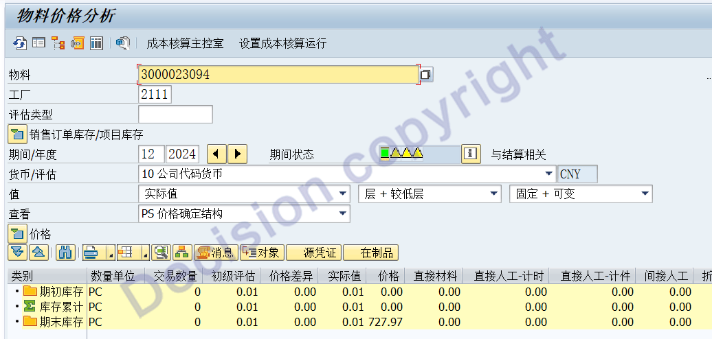 则系统计算标准成本金额 = 333.33 元/1000PC * 1= 0.33元