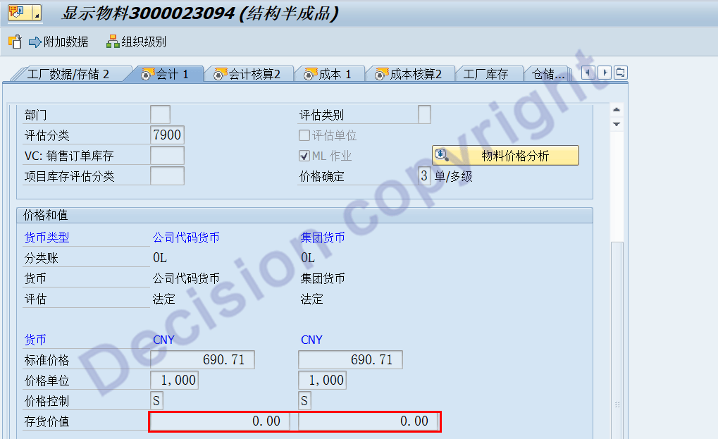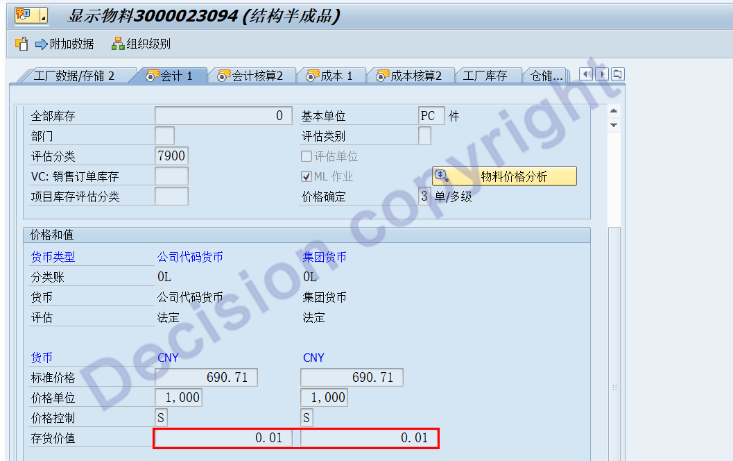 5. 处理后,事务码MM03,查看物料主数据会计视图。