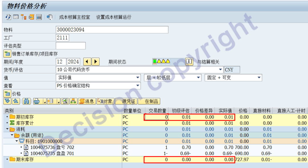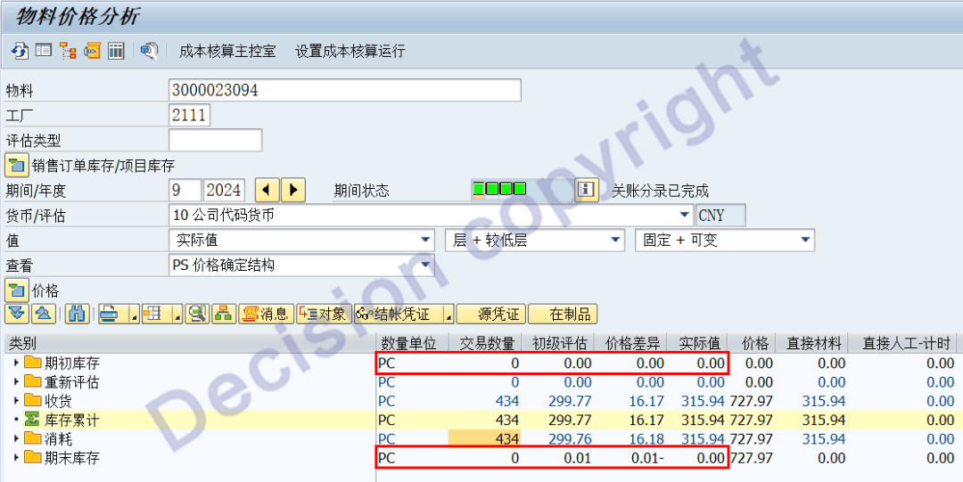 则系统计算标准成本金额 = 333.33 元/1000PC * 1 = 0.33元;考虑到出库后数量为0,则系统倒挤计算出库金额 = 0.34 元