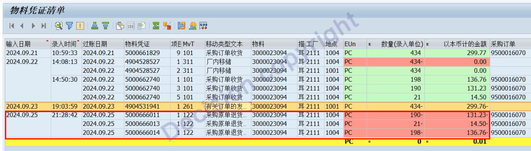 事务码MB51,查看2024年9月的发收业务,可以看到导致库存为0的最后几笔业务都:122采购退货,即:入库负数!