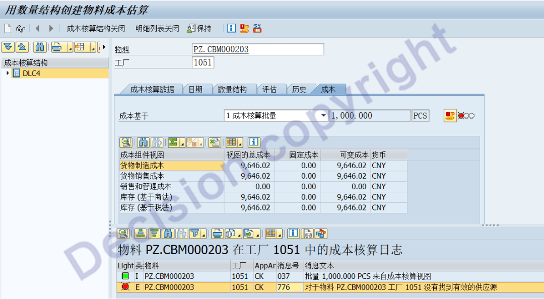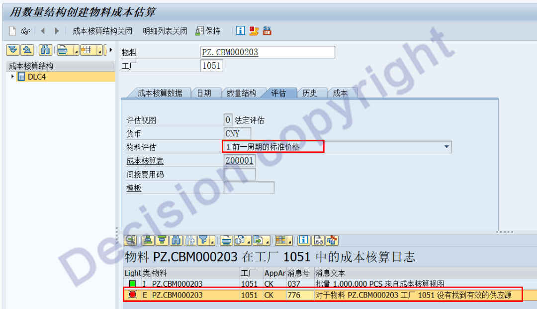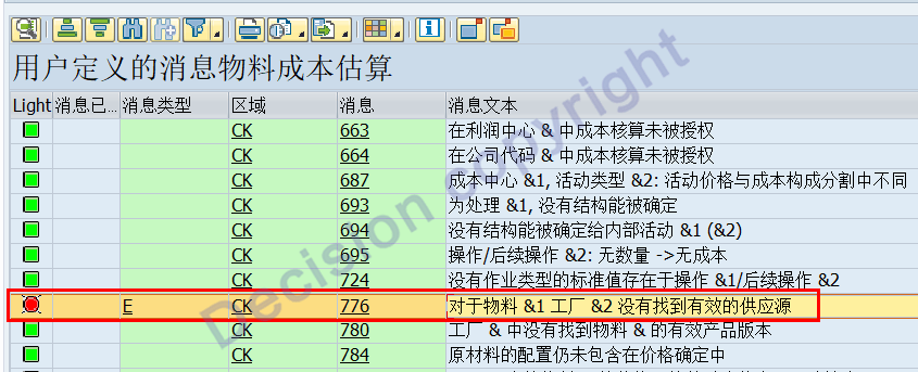 2. In the above situation (when calculating standard cost, the price has been selected in the fourth order, the information record is the third order price, and the third order price cannot be found), because the custom message CK776 is an error message, CK11N displays a CK776 error message.