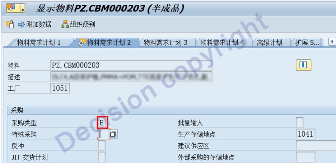 1. Use transaction code MM03 to view the MRP2 view and see that the purchase type is F (External Purchase).