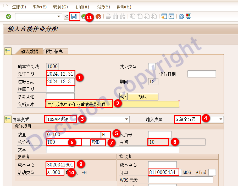备选调整方案:也可以使用 F-02, 将生产成本中心费用尾差余额,从FI模块,成本中心借方调出。