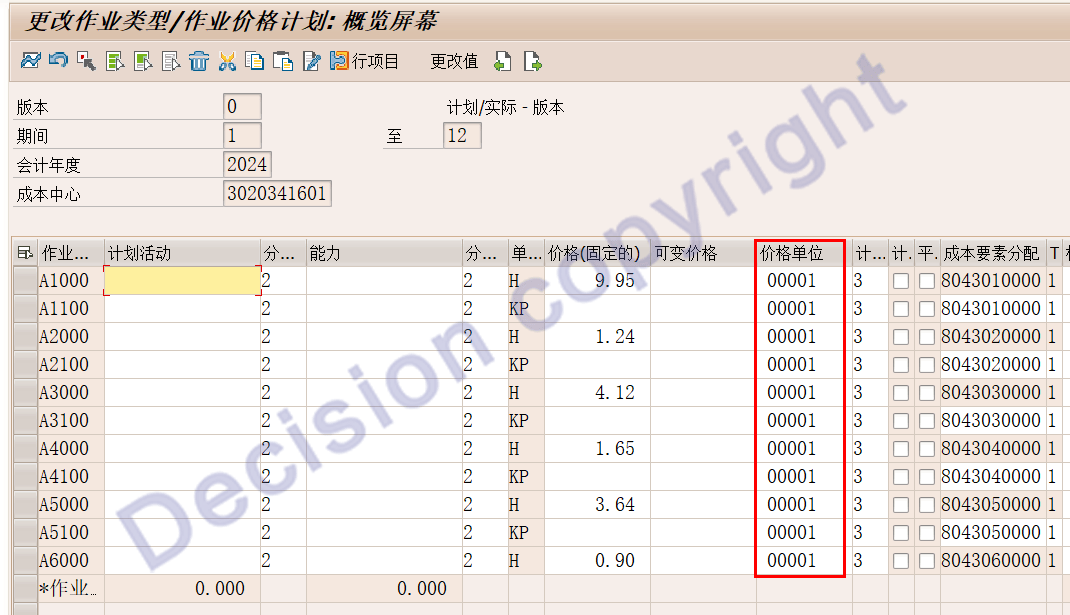 1)事务码KP26 维护成本中心作业价格时,价格单位,尽量使用1000或10000,不要象以下使用价格单位1来维护。