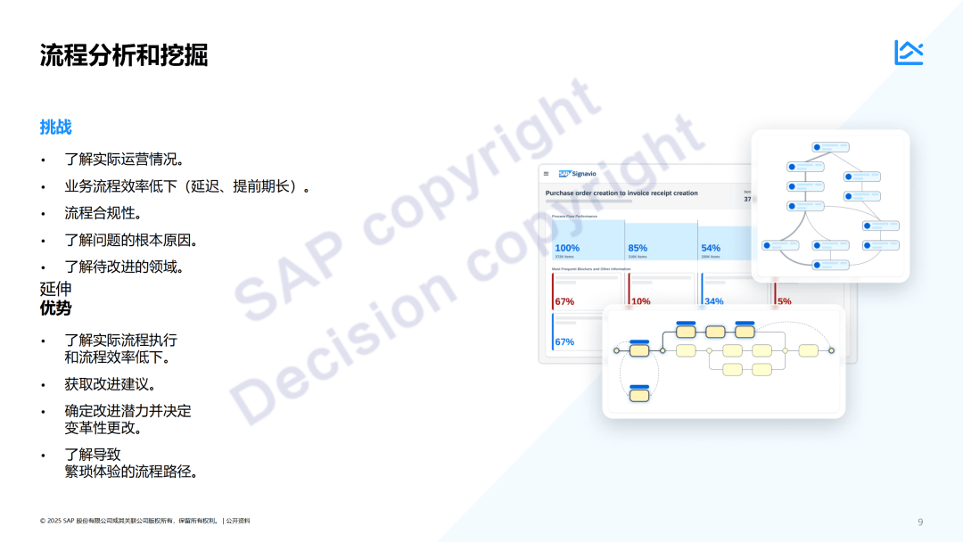 另一个工具叫Process Intelligence,支持SAP与非SAP系统(如OA系统、Ariba等)的流程挖掘,全面掌握跨系统流程运行情况,发现整合中的瓶颈与改进机会。