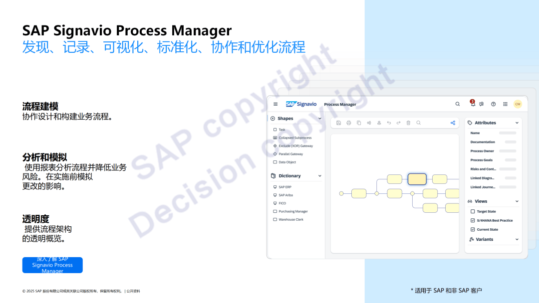 Signavio 提供两种工具:Process Insights(连接SAP系统分析标准流程)与 Process Intelligence(支持SAP与非SAP系统的流程挖掘),帮助企业发现实际运行中的流程变体与优化点。