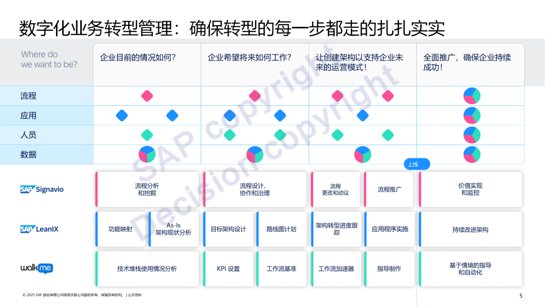 SAP通过BDC(SAP Business Data Cloud)帮助企业将数据快速整合起来,但是如何让企业更好、更快地了解自身用户,SAP通过以下三个层面来帮助企业进行卡点,实现从战略到执行的数字化转型管理: