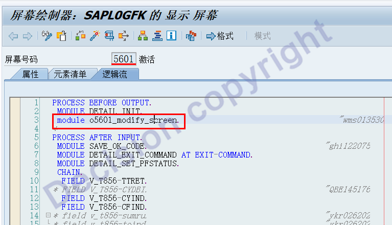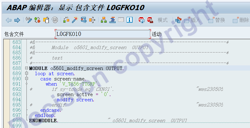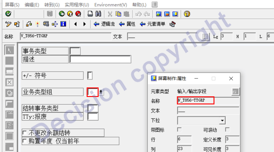 4. 进一步查看配置程序,发现,配置事务码中的屏幕输出前,程序强制关闭了字段:TTGRP 合并事务组。