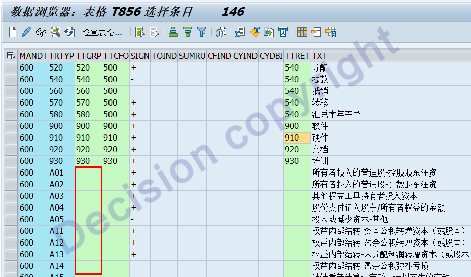 事务码OC08 或CXN01配置了相应的合并事务,为了检查合并事务配置是否正确,在事务码SE16检查T856表,发现自定义合并事务类型 A01-A15,对应的字段 TTGRP 合并事务组为空?系统哪个地方可以配置合并事务与合并事务组的关系?