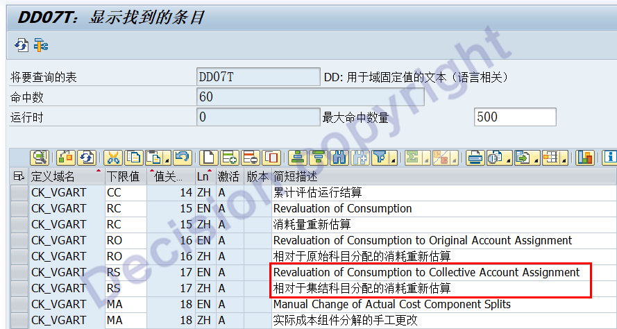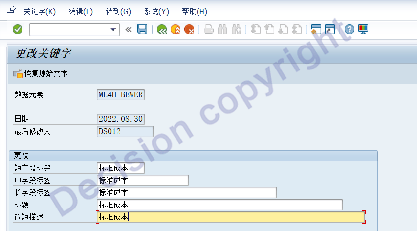 处理:SE16事务码,输入DD07T,输入域CKML_CATEG,语言ZH,然后,就可以对以上SAP的默认文本进行修改。